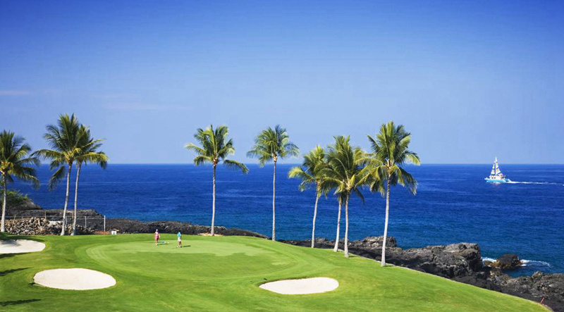 球場球道選用夏威夷草,果嶺為矮生百慕達草,與碧?;ハ嘁r托,和諧優(yōu)美的自然地理環(huán)境與球場的精心布局,可謂巧奪天工。